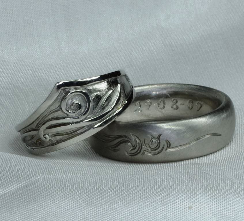 “Having known Richard for a long time and seen his designs online, he was the obvious choice to make our new rings. After contacting him, we arranged the initial consultation. Richard helped us to talk through possible designs that meant something to us and we decided to have rings based on each other’s tattoos. This was a great idea, pulled together by Richard during our chat, as Simon and I are quite different people, but wanted to have some element matching in the rings and both have tribal style tattoos. It’s nice as we spend a fair amount of time apart and it’s like having a part of each other with you all the time.