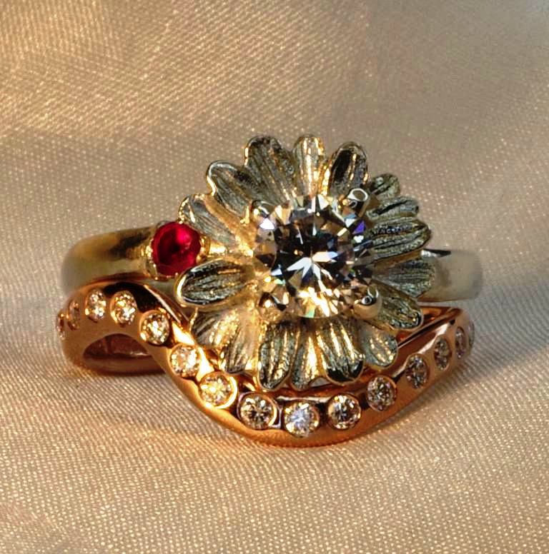 “Having looked at hundreds of styles of rings and not been able to decide my partner suggested we got something designed especially and found Richard’s website online. I went along to the appointment worried that I didn’t really know what I wanted but would feel pressured to make a decision that day, but this totally wasn’t the case. The most helpful part of the process was looking at the different types of each metal and comparing the subtle differences in colour against your own skin tone, as what suited me was different to what I thought I wanted. It came up that one of my favourite flowers are daisies and Richard came up with the design combining the metals I liked the most. The three of us then came up with the idea of adding a ruby/garnet to the band after looking at a photo of a ladybird on a daisy to symbolise my partner. Richard then made a brilliant suggestion of linking my engagement ring with my husband to be’s wedding ring by putting a ruby/garnet on the inside of his band.